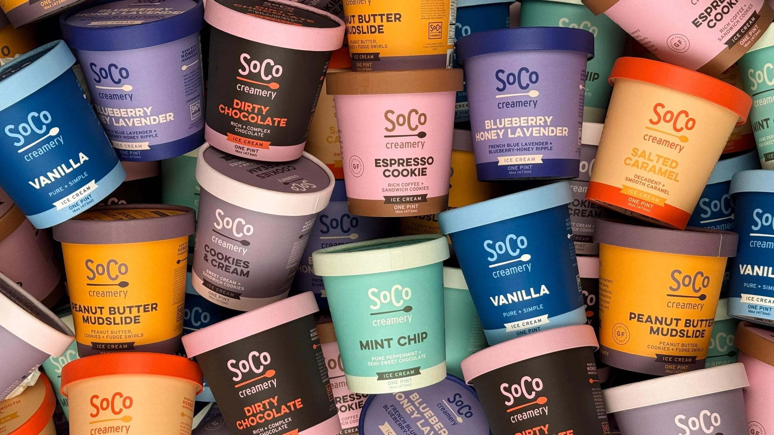Updated and refreshed branding for beloved, regional ice cream brand. New packaging reflects a more vibrant and consistent color palette, while maintaining the bones of existing SoCo Creamery visibility.