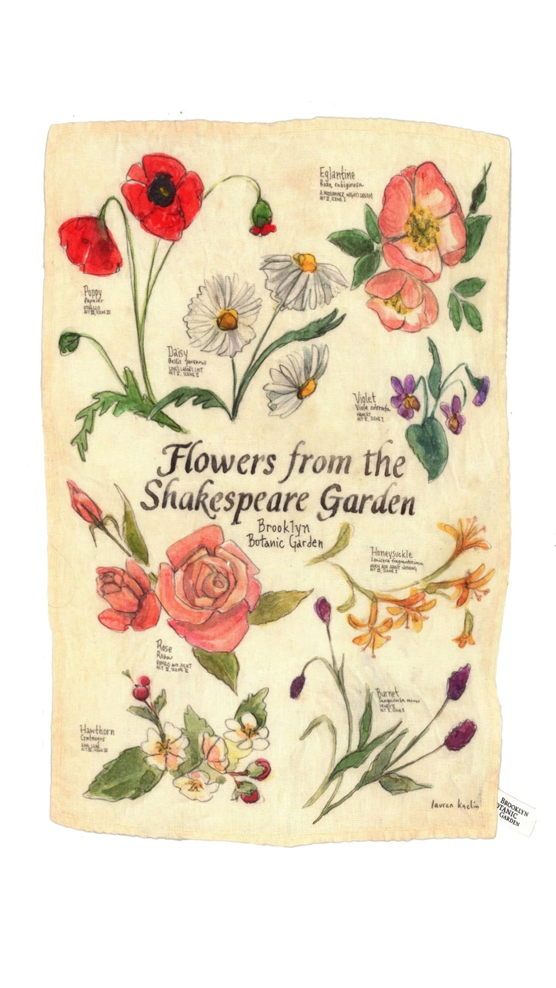 Designed in collaboration with Terrain for their Brooklyn Botanic Garden gift shop. Tea towels, trays, and mugs featuring illustrations and quotes of the Shakespeare garden.